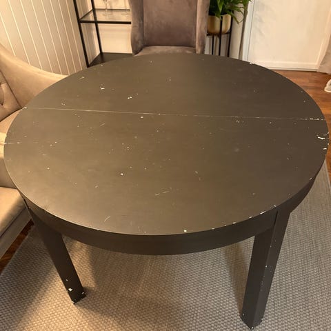 Rundt spisebord med to ileggsplater.