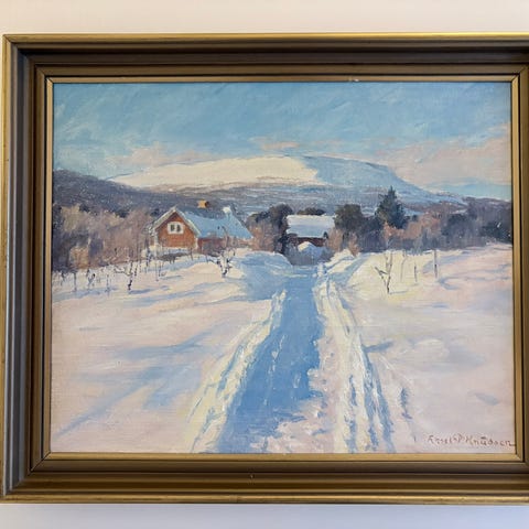 Aksel P Knudsen maleri som viser et snødekt terreng med trær og fjell. Maleriet er innrammet i en brun ramme og signert av kunstneren.