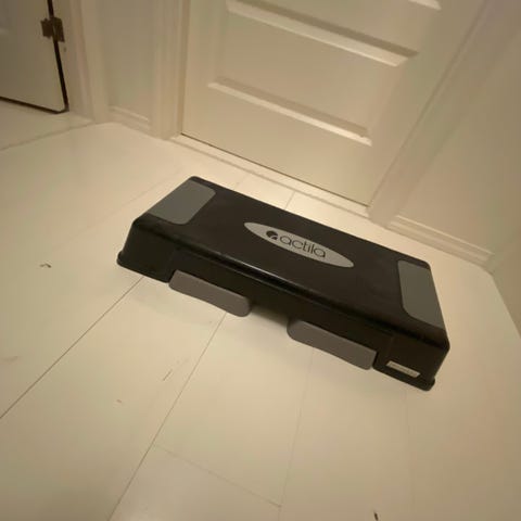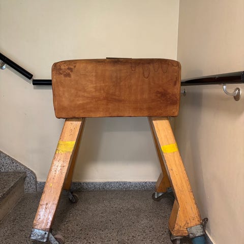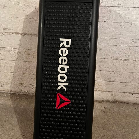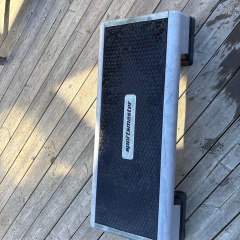 Kassen har en rød polstret topp som kan brukes for sittende øvelser eller som støtte under trening. Egnet for bruk i treningsrom eller gymnastikksal.