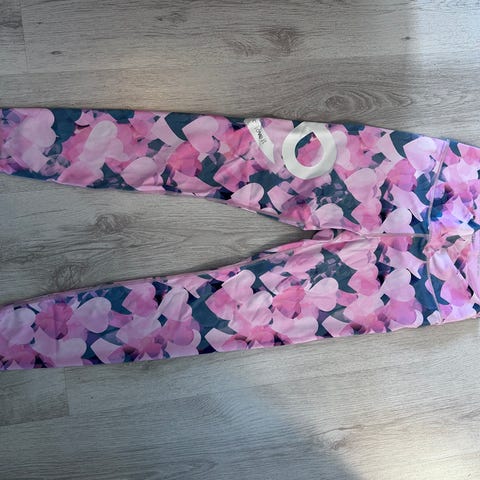 Nike treningsbukse for barn i størrelse 12-13år, laget for fitnessaktiviteter. Buksen er rosa med hvite og oransje detaljer, og er produsert i Dri-FIT materiale som bidrar til fukttransport og komfort under trening.