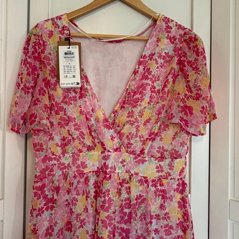 Va Vite Sommerkjole i størrelse XL (44)for kvinner. Kjolen er rosa med et mønster og laget av polyester. Den har kort erme og en løs passform.