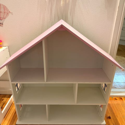 Hvit barnehylle med «vinduer» og rominndeling. Passer til bøker, barbie, lek og annen oppbevaring.