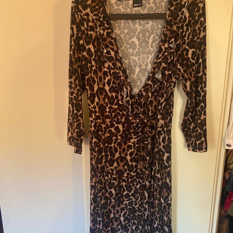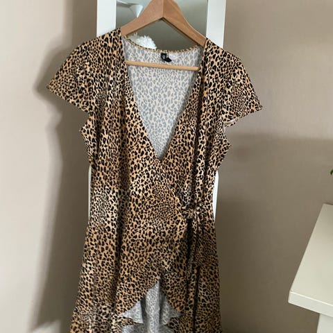 Fin omslagskjole med leopardmønster og volangdetaljer. Medium. Ukjent merke