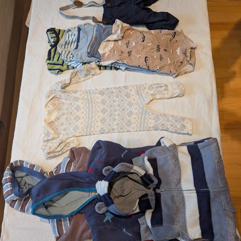 H&M barneklær i størrelse 68, flerfarget og unisex. Inneholder flere plagg med varierende farger og mønstre,