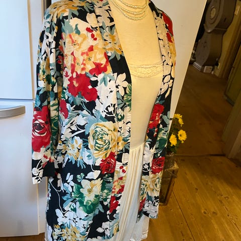 Fin, svart velurjakke/fløyelsjakke i kimonomodell med knytebelte. Brukt en gang. Bilder av grønn jakke for bedre å se detaljer.