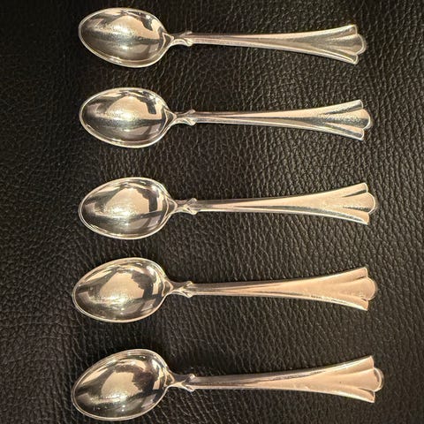 6 stk emaljerte kaffeskjeer/mokka skjeer med patina.