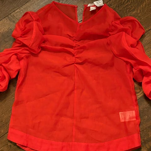 Kul rød og hvit prikkete topp uten stropper og med strikk i livet.