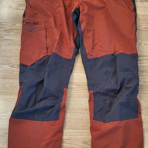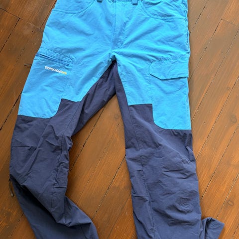 Buksene har blå farge med svarte detaljer og er designet for å gi beskyttelse og komfort. Pent brukt, men få hvite små flekker på en side - se bilde. Hel of i , ikke hull, slitasje ol.