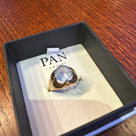 Pin-brosjen er av sterlingsølv forgylt med 24 karat gull. På nettsiden i dag står det 22 karat, men i denne boksen står det 24. så altså rent gull.