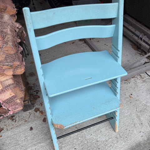 Stokke høy barnestol i hvit farge. Stolen er laget i tre og har justerbare setehøyder. Stolen har mye slitasje på overflaten, se bilder. Inkl baby set (+ puter, smekke)