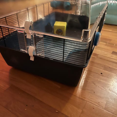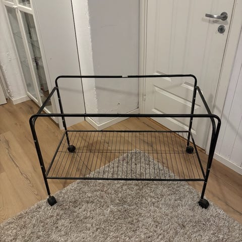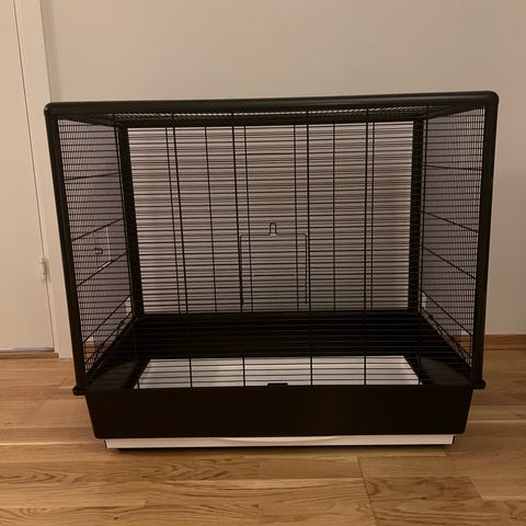Bur i metall med svart farge. Bur med håndtak og dør, egnet for oppbevaring eller transport.