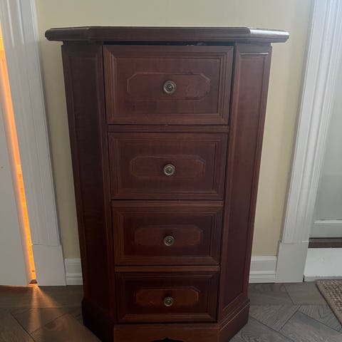 Små og nette soveromsmøbler selges. Bredde på skjenk er cirka 130cm. Bredde nattbord cirka 50cm.
