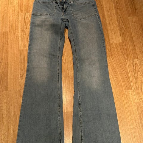 Jeansene er så godt som ubrukte, ene toppen er ubrukt. Siste toppen mangler en knapp øverst i halsen.