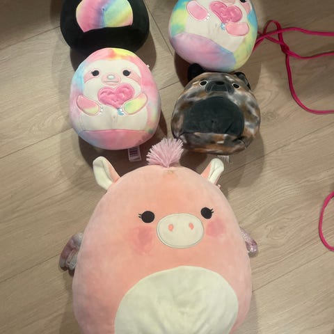 3 Squishmallows, myke kosedyr for barn. Laget i mykt materiale, tilgjengelig i ulike farger og design. Egnet som lek eller dekorasjon.