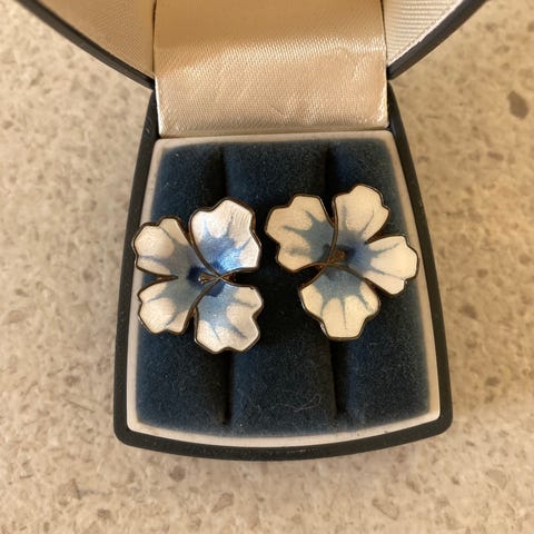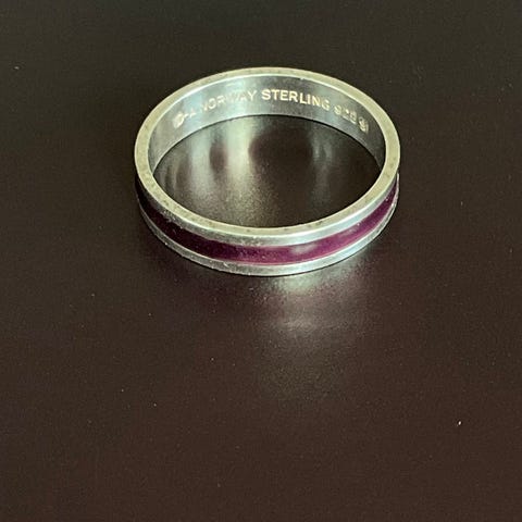 Selger en fin, liten sølvring med grønn emalje fra David-Andersen.