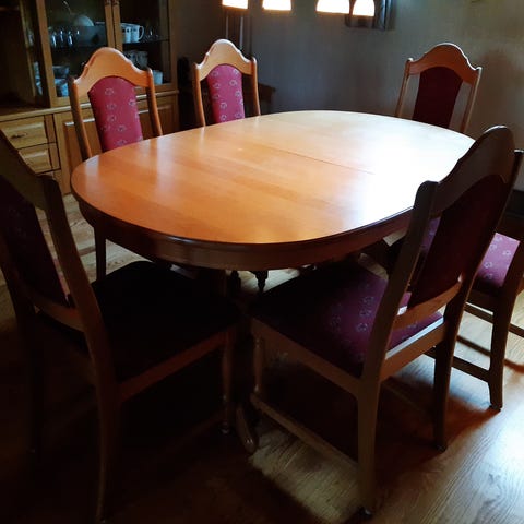 Pent brukt furu spisebord og stoler. Bordet er 104 cm. Mulighet for å forlenga bordet til 150 cm
