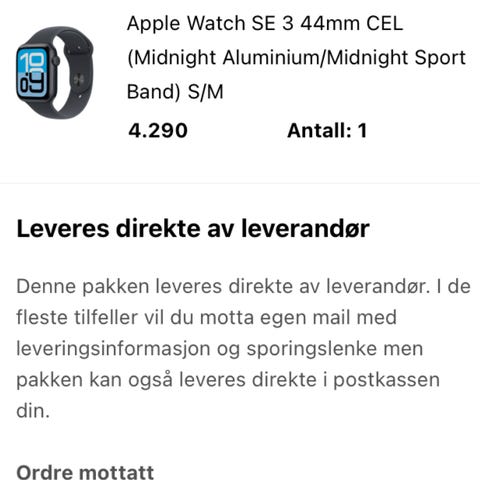Kjøpt ny hos Apple i slutten av september 2025. Ser pen ut, ingen sjenerende bruksmerk som jeg kan se. Det følger med lader, og kvittering kan sendes digitalt om ønskelig. Esken finner jeg sannsynligvis ikke.