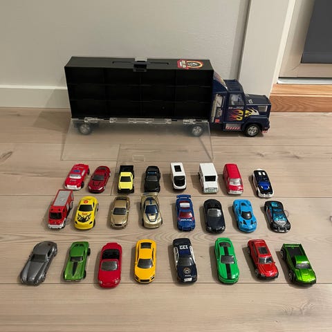 Denne lastebilen er et stort leketøy i seg selv, men også praktisk oppbevaring til lekebiler og lignende.