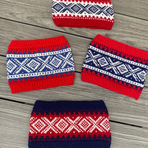 Hjemmestrikket sett med sokker og pannebånd i damestørrelsei mange flotte farger. Har tillatelse til å selge Marius-strikk.