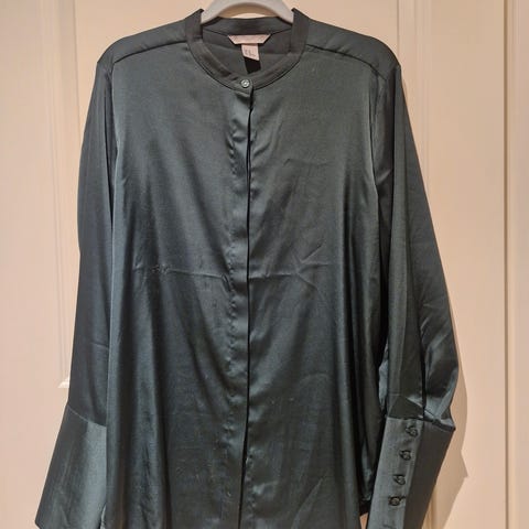 Fin sort bluse i et tynt og lett stoff. 3 knapper bak til lukking, og en liten splitt etter knappene. Litt høy krave.