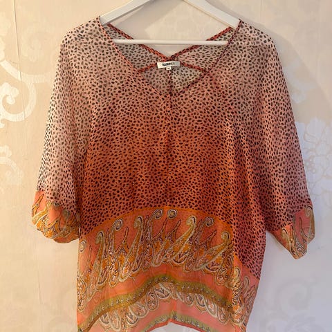 Katrin Uri v- halset topp laget av 100% silke i størrelse S. Stor i størrelsen, jeg er normalt M. Flerfarget mønster med lett og luftig materiale.