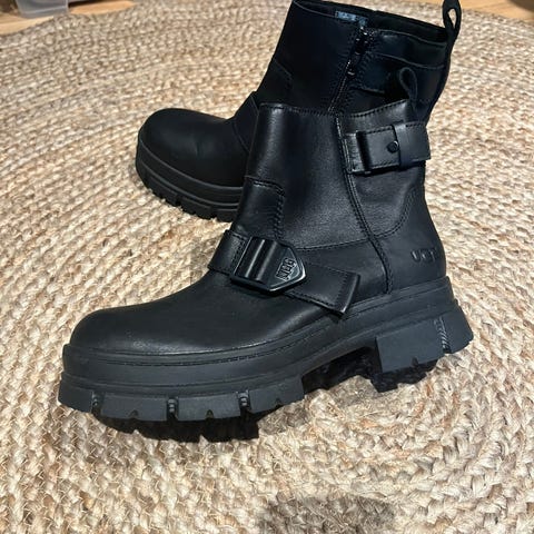 UGG Classic Ultra Mini støvler i svart, størrelse 39. De er pent brukt men har noen merker, tror de kommer fra salt og snø og kan sikkert fjernes.