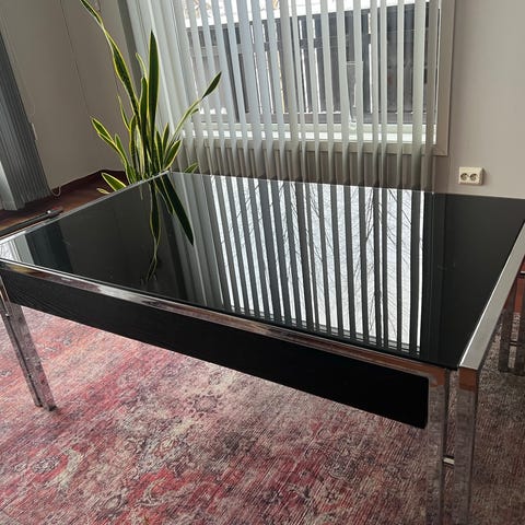 Sofabord med glassplate, to nivåer og skuffer. Praktisk løsning der ting kan ligge under eller i skuffene, slik at toppen alltid ser ryddig ut.