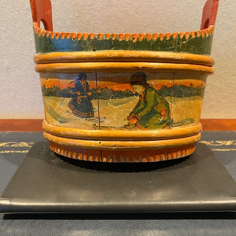 Rosemalt ølkjenge selges, med skader/rep. Selges kr 1200.