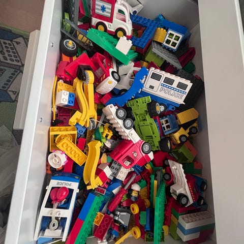 Inkl Lego plate, brannbil, politibil, lego mennesker, sjørøverskip, dyrepark osv.