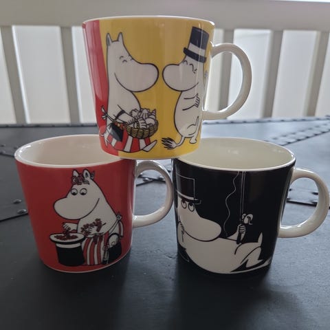 Utgått Arabia Mummikrus Tooticky. Det har noen merker etter å ha vært pakket i avispapir under flytting. Selges derfor rimelig. Har også andre mummikopper til salgs, ta gjerne en titt på mine andre annonser.