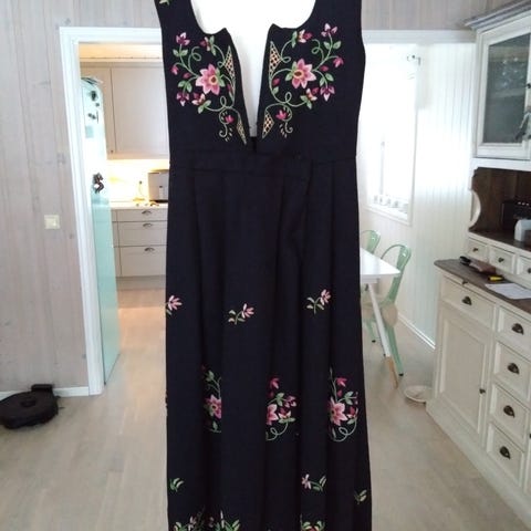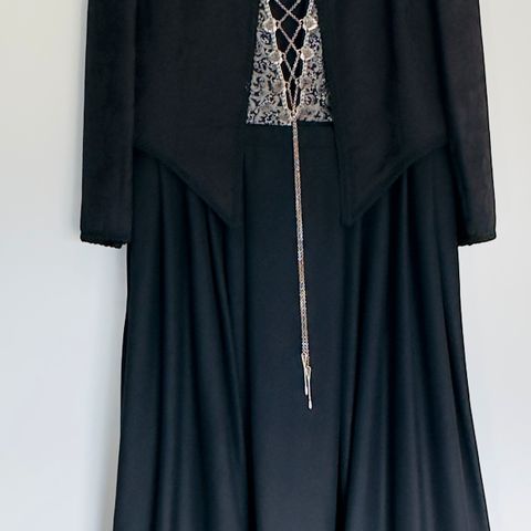 Sydd på 1980-tallet, str. M. Skjørt (midje 71 cm) og foret jakke med skulderputer (vil om ønskelig kunne fjernes av en sømkyndig). Knapper, hekter og beltespenne i tinn. Skjorte i lett bomull. Brukt 3-4 ganger.