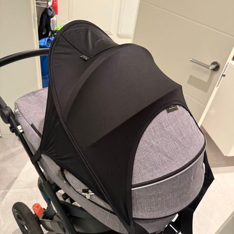 Emmaljunga barnevognsbag i mørk blå farge med polstret innside i lyst stoff. Passer til bruk som liggedel til barnevogn, med tilkoblingsfester for enkel montering. 2021 modell.