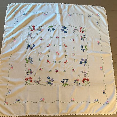 Fargerik og utrolig flott håndbrodert linduk. Mulig en blanding av bomull og lin, er ikke 100% sikker på materialet, men du verden så flott uansett 😅❤️🧡💛💚🩵💜