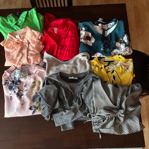 Selger en klespakke med de førsteplaten fra Floyd. Alt fra S/M/L men alt passer en M. Selger da jeg har mange bluser fra da jeg jobbet på Floyd. Pent brukt men har alt for mange bluser🫶 ingen bruksmerker (litt skrukkete men bare å dampe eller stryke de)