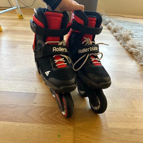 Rollerblade barn rulleskøyter i størrelse 33 - 36. Skøytene har svart og rød farge og er designet for rulleskøyting.