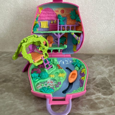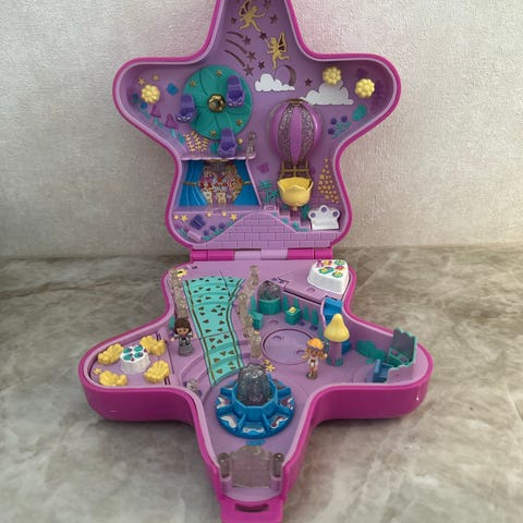 Selger Polly Pocket Magical Movin' Fairyland fra 1997. Eventyrland med fehytte og hager, magisk tre, hemmelig fehus og Magisk Polly-hytte. 25 ulike funksjoner som aktiveres ved hjelp av blomsterstolpen i den rosa dammen, som utløser en magnet.