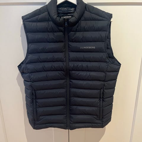 J. Lindeberg dunvest i blå farge, størrelse M. Vesten er laget av dun som isolasjonsmateriale og er designet for utendørs bruk.