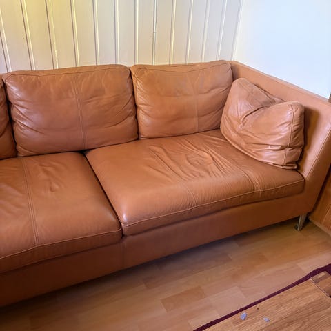 Sofaen er trukket i eksklusivt brunt/cognacfarget skinn, med solid ramme og komfortable puter. Pent brukt i røyk- og dyrefritt hjem.