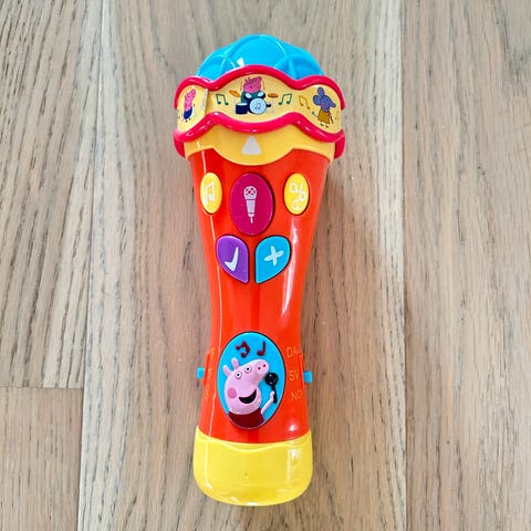 Peppa Gris "syng og lær" mikrofon i plast. Mikrofonen har flere knapper og funksjoner, inkludert lydinnstillinger med valg mellom dansk, svensk og norsk språk. Spiller Peppa sanger og stiller spørsmål.