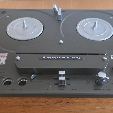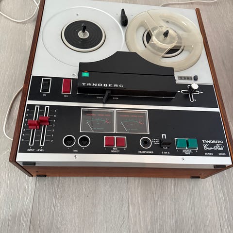Er svart nå, men det følger også med en egen dele-maskin til denne. Da uten lokk og knotter, men med et kabinett i treverk om man vil bytte. Her er også clutcher og diverse. Kan også følge med et par lydbånd som passer denne. Pakker godt og sender for kjøpers regning.