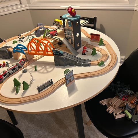 Stort og fint BRIO togsett selges (samlet!). Settet består av lang togbane i tre med flere sløyfer, broer, fjellpartier, rundkjøring, lasteområde og gård med dyr og gjerder.