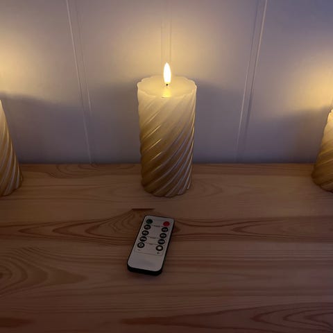 3 store led kubbelys til bruk ute. Ø 10cm. Høyde 15cm 20 cm og 25 cm.