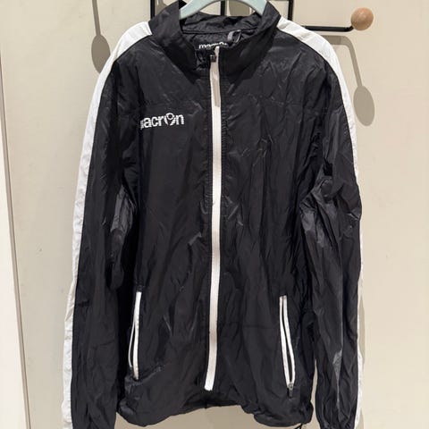 Macron fotballjakke for herre i størrelse L. Jakken er designet for bruk i forbindelse med fotballaktiviteter.