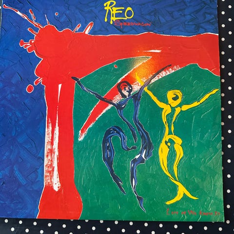 REO Speedwagon Wheels Are Turnin' LP vinylplate. Musikkalbum med cover som viser bandmedlemmer og tekniske illustrasjoner. Passer for samlere og musikkinteresserte.