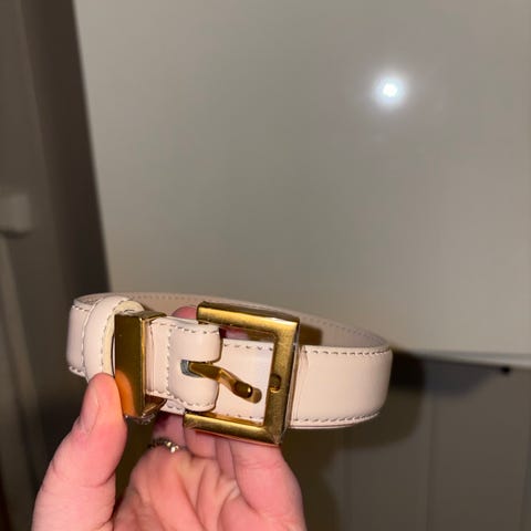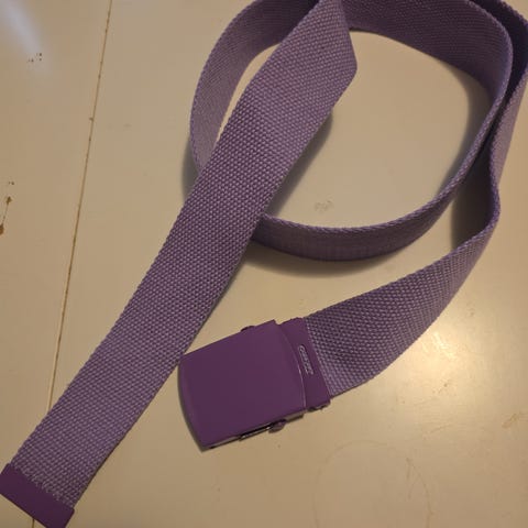 Canvas belte - unisex - i beige farge laget av bomullsmateriale. Beltet har metallspenne med noen synlige bruksmerker.