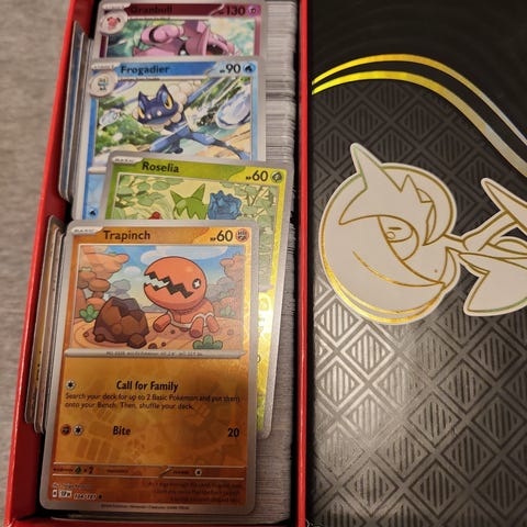 Pokémon samlekort sett med ulike kort fra forskjellige serier og typer. Kortene viser forskjellige Pokémon-figurer med varierende egenskaper og angrep. Passer for samlere og spillere av Pokémon kortspill.
