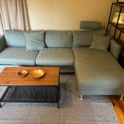 Brun hjørnesofa laget i stoff. Sofaen har flere puter og gir sitteplass til flere personer. Passer til oppholdsrom og stue.