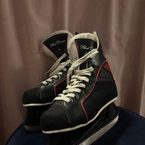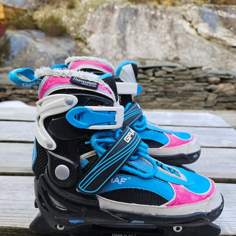 Regulerbare Ishockeyskøyter for barn i størrelse 32-35. Skøytene har blå og sølv farge, med justerbar størrelse. Egnet for ishockeybruk.
