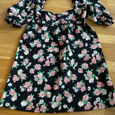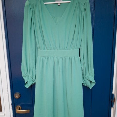 Pen kjole til fest og hverdags. Tynn og lett i stoffet. Høy pen krage, og synlige knapper til nedpå brøstet. Ingen lommer. Belte i livet. Ingen splitt i sidene. Kne langt.
