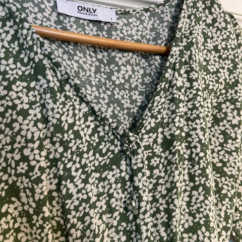 Fin grønn kjole med blomstermønster og blondeliv..Flaggermusermer